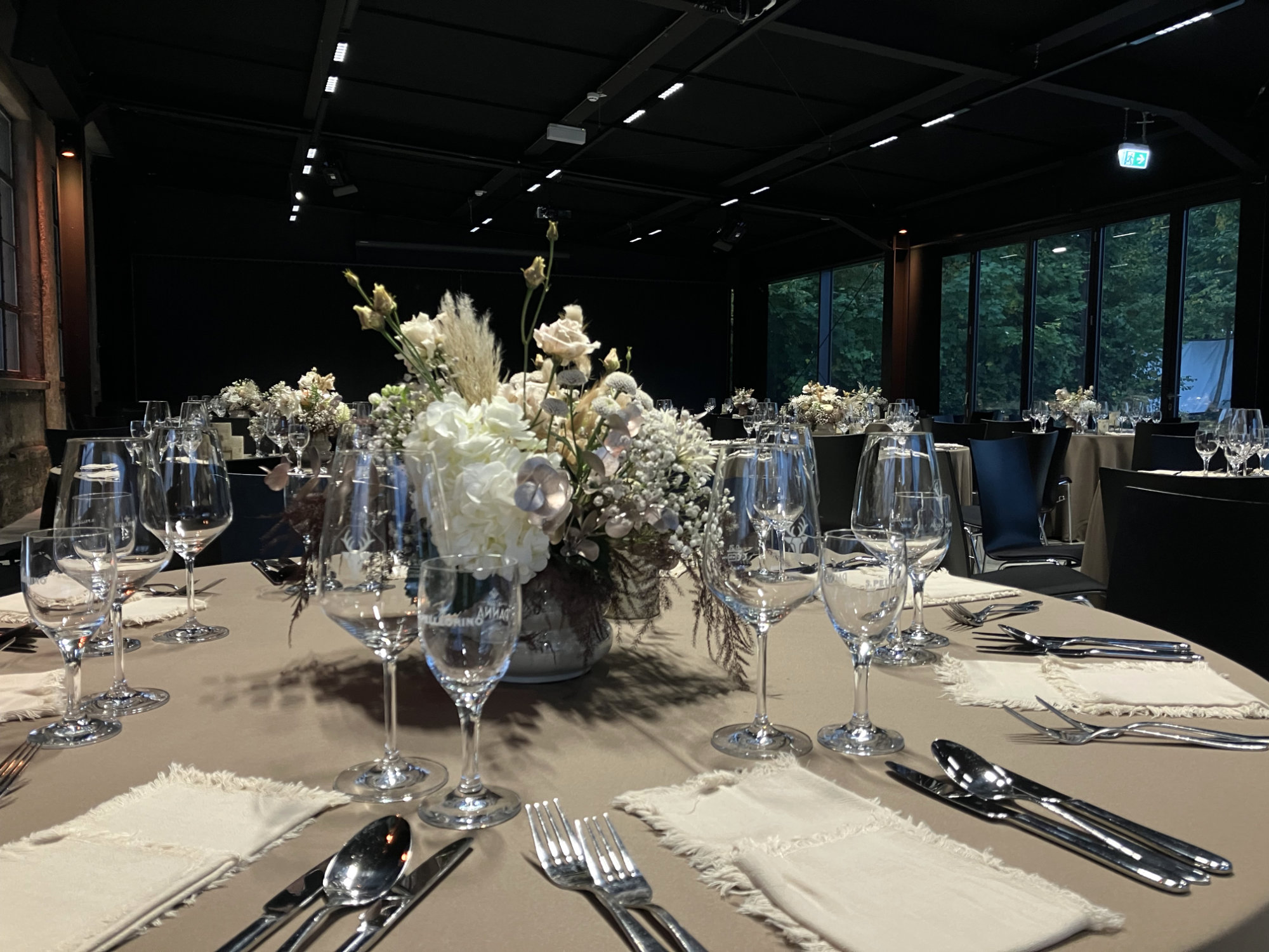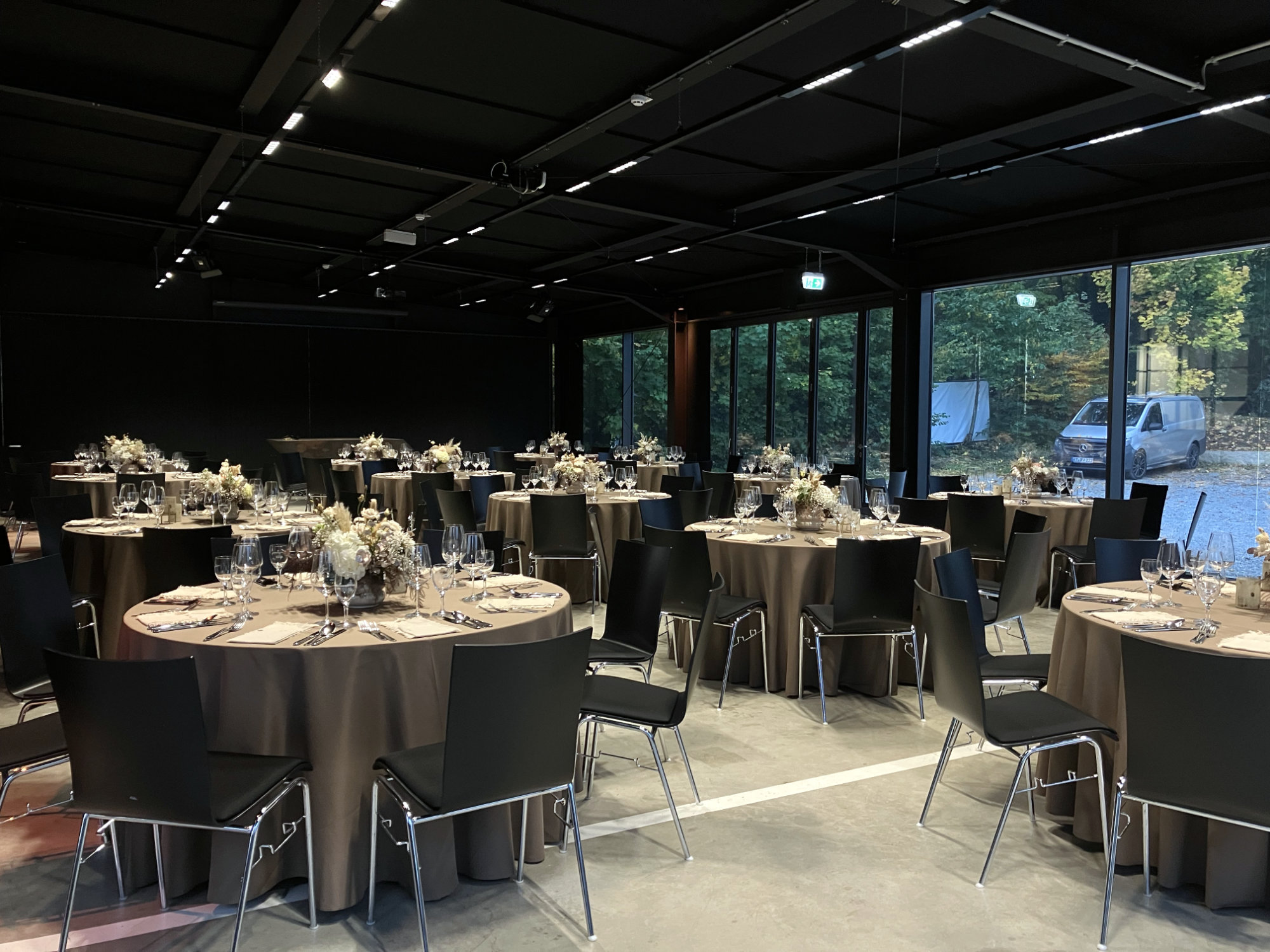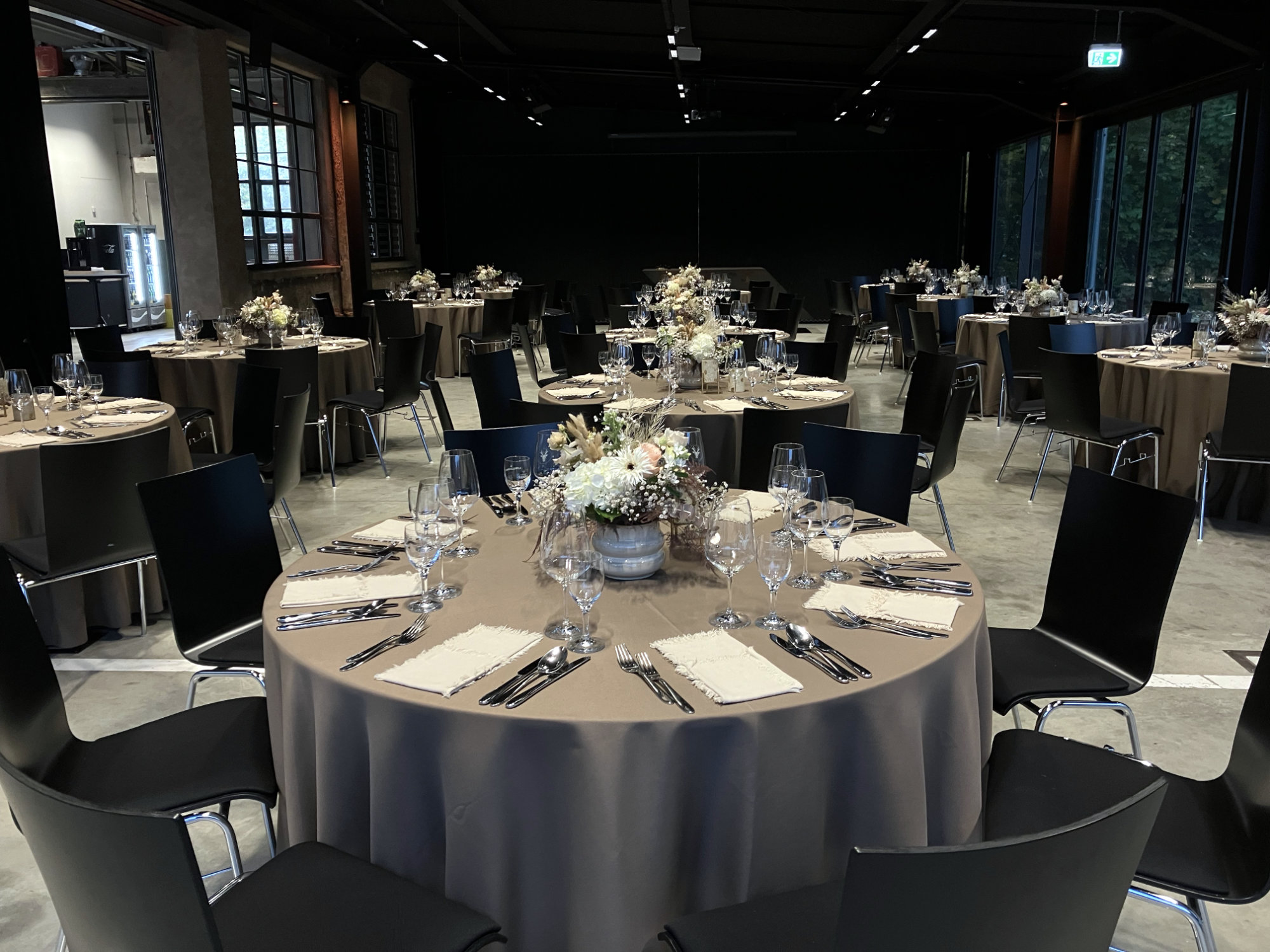 Große Eventlocation mit festlich eingedeckten Tischen und modernen Stühlen für ein stilvolles Event