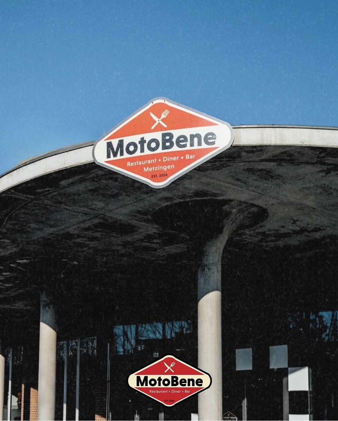 Schild mit Logo "MotoBene" über modernem Runddach eines Restaurants.